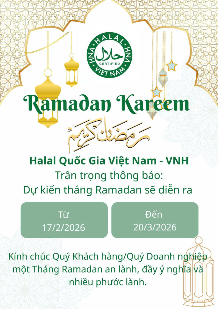 Tháng Ramadan là tháng linh thiêng nhất trong đạo Hồi (tháng thứ 9 âm lịch Hồi giáo), đánh dấu thời điểm kinh Qur’an được mặc khải cho Tiên tri Muhammad. Ý nghĩa chính là rèn luyện kỷ luật bản thân, thanh lọc tâm hồn, củng cố đức tin và chia sẻ với người nghèo thông qua việc nhịn ăn (Sawm) từ bình minh đến hoàng hôn. Halal Quốc Gia Việt Nam – VNH trân trọng thông báo đến Quý khách hàng thời gian thực hiện tháng Ramadan từ ngày 17.02.2026 đến hết ngày 20.3.2026.